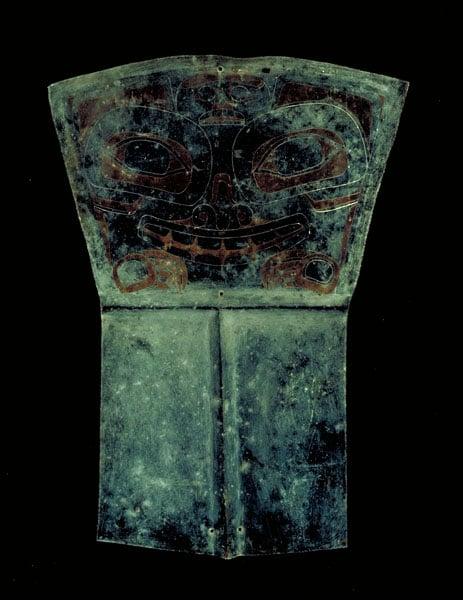 Copper currency shield from the North West coast of America. On the upper portion is painted a figure of the bear in the highly conventional style of the region. The outlines are emphasised by incised lines, apparently executed at a later date. Such shields formed a very valuable unit of wealth in former times.