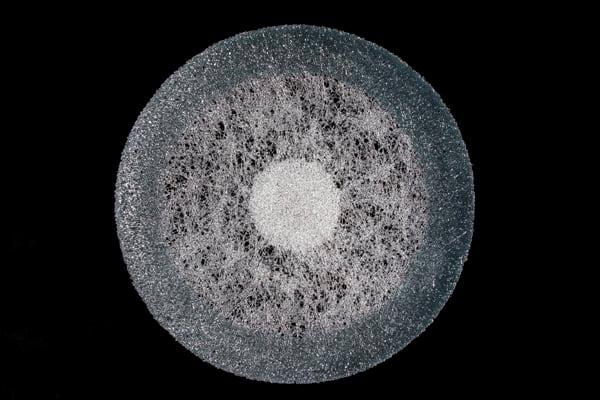 Disk made from threads of glass. The artist creates filaments from molten glass and arranges them into a design. This is refired to fuse them and the resulting lattice moulded into a shallow bowl.