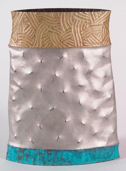 Kaneko's work is characterised by his raised relief work on elegant standing vessels, and his delicate treatment on the surface of the metal, both with colour and patination. The artist has managed to create a beautiful object from a base metal.