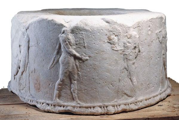 This cylindrical drum is decorated in low relief with 10 figures of deities and heroes. At the front two short processions meet, on the left is Apollo with his lyre who leads Artemis and another woman (probably their mother Leto), on the right is Athena/Minerva leading Herakles/Hercules and a veiled woman (Hera or perhaps Aprhodite). At the back, from left to right, is Hermes/Mercury leading 3 dancing women. This work was acquired with assistance from the Wolfson Foundation.