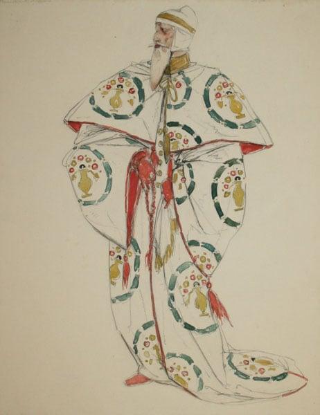 A costume design for the Doge in Shakespeare's 'The Merchant of Venice'. Part of a collection of drawings representing Rickett's work for the stage from his first designs for the English literary theatre down to post war costumes for the commercial stage. Charles Ricketts had been a member of the Executive Committee of the National Art-Collections Fund for 15 years when he died in 1931, and the Committee were glad to take the opportunity of purchasing from his executors, on favourable terms, the collection of theatrical drawings and designs which he left behind him. They did so in view of the fact that the drawings represent an important phase in the artist's work and in memory of one who, among all his many other activities, had for so long given to the Fund the best of his advice, taste and experience.