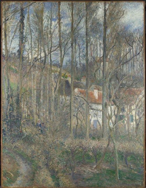 This work depicts a hillside with white houses and red roofs seen through tall leafless trees. There are small fruit trees in the foreground and two women in blue in the undergrowth to the left with a small stream in the left corner. Painted at Pontoise.
