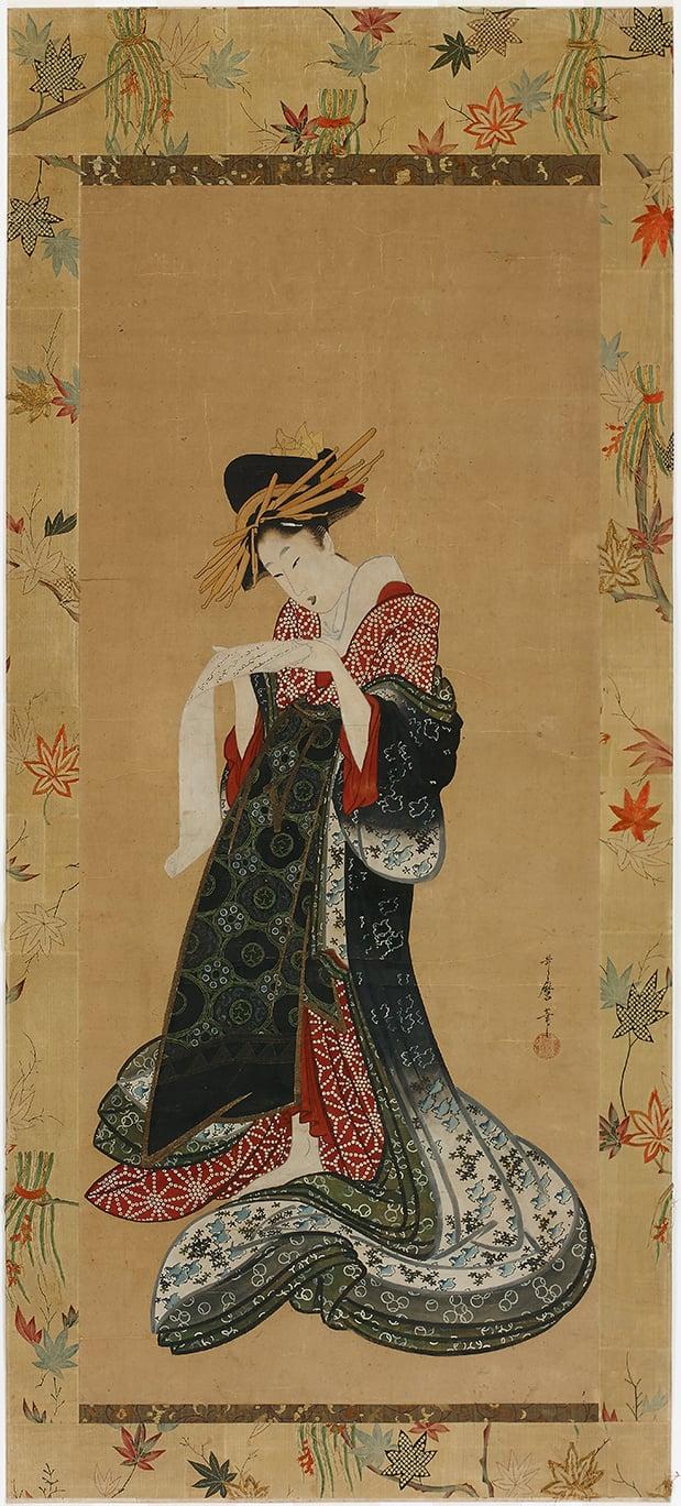 Along with his contemporary Hokusai, Kitagawa Utamaro was one of the best-known artists of the Ukiyo-e ('Floating World') style, a genre of woodblock painting that flourished in Japan from the 17th to the 19th centuries. Their work, in the form of affordable colour prints, was ubiquitous throughout Japan, and both artists were household names within their lifetimes. Utamaro was most celebrated for his depictions of women, and he was the key figure in the development shunga, a genre of sexually explicit art. While more than 2,000 of Utamaro's woodblock prints survive, original paintings are extremely rare – many were destroyed during the regular fires and disasters that afflicted the city of Edo. Only around 40 original paintings are thought to be extant, many of which are only known through photographs in old publications. Courtesan Reading a Letter is a new discovery. Its existence has never been recorded or published, making its acquisition a key opportunity to gain new insights into Utamaro's work. It depicts a courtesan in Yoshiwara, a government-licensed prostitution quarter on the northern edge of the city of Edo. The courtesan is shown wearing sumptuous robes and hair ornaments, signs of her high status, while she stands reading a letter. The letter's contents are illegible, leaving the viewer to guess at its contents and the identity of its author.