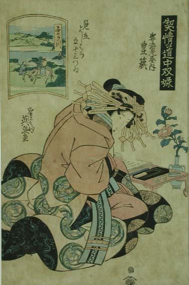 Courtesan sitting at low table with writing materilals; inset, River Scene
