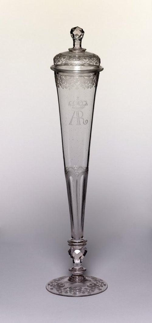 Covered fluted glass. Wheel-engraved with strapwork and the initials 'A R', and was probably used at the Court of Augustus the Strong, Elector of Saxony and King of Poland (1697-1704, 1709-33).