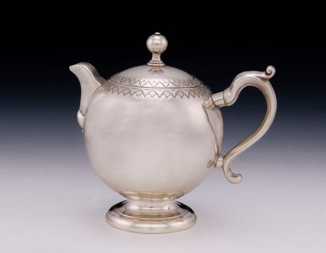 Spherical body and moulded foot, the hinged cover has a knob finial. There is a curved S-handle with scroll thumb-piece cast in one piece. The only decoration is a double band of simple chevrons engraved on the cover and body where the two meet. One of five gifts to three museums by H Eric Miller through the Art Fund between 1928 and 1946.