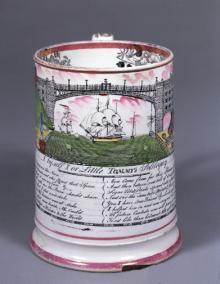 Creamware mug. The upper part is decorated wwith a view of Wearmouth Bridge, the lower part with verse about Thomas Wilson, the engineer used by architect Rowland Burdon to construct the bridge.