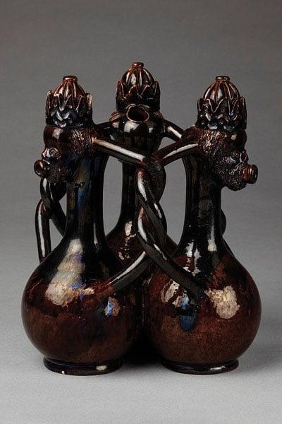 Croatian Puzzle-Vessel of grey earthenware. Form: 3 bottles with heads representing Leh, Meh and Ceh, the 3 ancestors of the 3 branches of the Slavonic race.