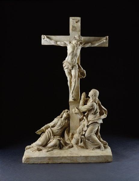This is a highly important and beautiful terracotta Crucifixion group by one of the greatest sculptors of 18th-century France. The terracotta is the model submitted by the artist to the Chapter of Rouen Cathedral in August 1785 for the large gilt-lead Crucifixion which crowned the Neo-Classical rood-screen. This great project, one of the most stupendous interventions in any religious building in Pre-Revolutionary France, was dismantled in 1884 and the sculptural remains further damaged by bombing in 1944. The terracotta is the prime surviving evidence of the artist's greatest religious commission and one of the few surviving testimonies to his religious work. The terracotta has been on loan to the Museum since 2003 and is the focal point of the display of small sculpture in the 'Arts of the 18th Century' gallery, part of the Museum's immensely popular series of new galleries.
