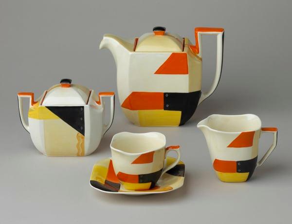 Cube shape teaset decorated with 'Galaxy' pattern, c. 1932