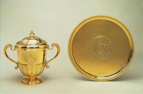 Two-handled covered cup and a salver on detachable foot, both silver-gilt, made in London by Thomas Farren, 1715, and engraved with the full arms of the South Sea Company chartered in 1711. Total weight 141 oz.