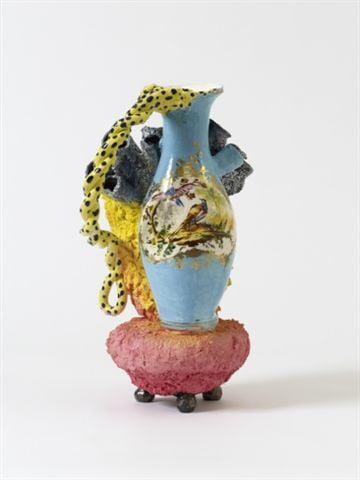 Created by the young New York-born artist Francesco DiMattio, Cuvette á Tombeau features an intricately painted bird-on-branch design beneath a smooth glazed finish, inspired by the 18th-century 'flower vases' produced by the manufacture nationale de Sèvres. After that, the resemblances to rococo porcelain end. In their place, a twisting leopard-print double helix loops down to join the base of a corraline growth topped by organic tubes, all perched on a pink cushion balancing on three stubby feet. The piece is typical of DiMattio's work, which splices classical porcelain design with kitsch forms to create playfully incongruous ceramics. The Cuvette joins works by Bernard Leach, Michael Cardew and others in Paisley Museum's nationally important collection of ceramics.