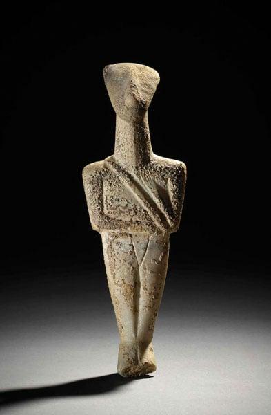 This rare figurine depicts a ‘hunter-warrior’ type characterised by the presence of a belt and baldric (belt worn over the shoulder to hold a weapon). This is the first sculpture of its kind to enter a UK public collection and there are only three others known in the world. The British Museum holds the leading collection of Cycladic figurines in the country. The people of the Aegean islands known as the Cyclades began to produce objects in the early Greek Bronze Age. The museum has a drawing of a figurine of this type as well as female Cycladic figurines which can be linked stylistically with this male figure.