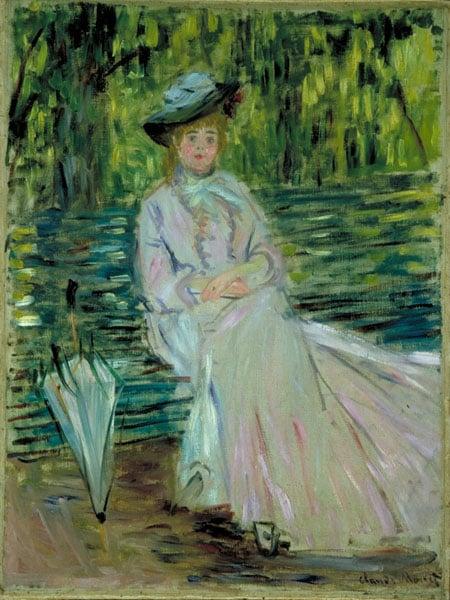 This full-length sketch shows Madame Monet in a pink dress and grey hat seated on a green garden seat, a white parasol by her side. Sunlit trees form the background. On loan from the Tate.