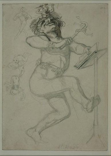 A dancing jester conducts music, whilst tiny imps float around him playing musical instruments. Part of a collection of 115 works distributed to 21 public collections. Sir Edward Marsh bequeathed his modern pictures to the Contemporary Art Society and the remainder of this collection to the Art Fund for selection and distribution to suitable galleries. The drawings consist mainly of works by English artists of the 18th and 19th centuries. Perhaps the most important groups are the Romneys, Wilsons and Rowlandsons all chosen with the discriminating taste which invariably distinguished Sir Edward Marsh's acquisitions.