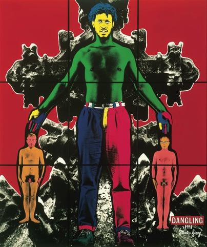 Photopiece in 9 panels. Central figure, a topless black youth stands with outstretched arms in a Christ-like pose in front of a black and white cemetary cross on a red background. The smaller naked figures of Gilbert & George dangle beneath his hands.