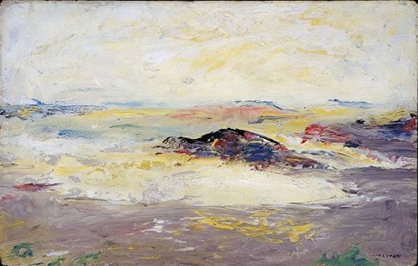 Yeats painted the ordinary things of life, but saw them in an extraordinary way, leaving it to the viewer to construe the meaning. His style became more strikingly personal in the mid 1920S, when landscape for him became a vehicle for introspection, and he tended to choose views for their emotional and historical associations. This view is preoccupied with the prevailing light rather than with the landscape per se, recalling, perhaps symbolically, a particular moment when the sun shone. He takes the lemon yellow in the sky, and reflects it onto the sea, which is pierced by black rocks jutting out from the grey of the water. Darrynane (In the Sun), with its gleaming wreath of floating sun, is one of the small precursors of the great visionary views of his late period, which are figurative, and where man and earth share emotion together.