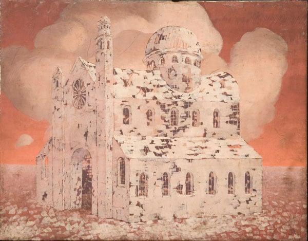 Southampton holds a significant cluster of British Surrealist paintings and drawings but this is the first work by Armstrong to enter the collection. Armstrong was an important, influential and highly original artist associated with the British Surrealists. He was a member of Paul NashÂ’s progressive Unit One in 1933 which promoted both abstract constructivism and surrealism. This painting was created during his time as an official war artist. His wartime landscapes of bombed buildings exemplified by Dead Church became increasingly transformed into places of ruin and desecration, signifying the ultimate sacrifice of war. The broken, brick-like strokes suggest that the fabric of the hollow church is paper-thin, about to be blown away like leaves in the wind.