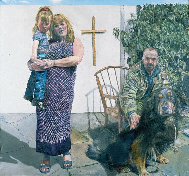 The painting depicts Debbie, her youngest child Shannon, her brother Billy and their dog, together in their back yard of their house in Barrow-upon-Soar, Leicestershire. Alan first got to know her as a police officer and Debbie is a challenging local character. Now a born again Christian Debbie plays a central role in village life and has built bridges between the police and vulnerable groups. Alan asked to paint her as a result of winning the National Portrait Gallery's annual Travel Award 2001.