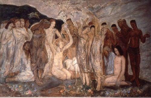 Invocation to Dance reflects the influence of the Russian Ballet, which was in London at the time of it's executiion. The figure raising his right hand, on the left of the picture has been identified as Nijinsky in his role for 'Scheherazade'.