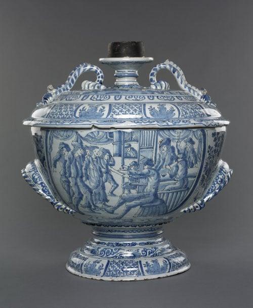 Large covered bowl of delft ware with drinking scenes, perhaps made at Lambeth, 1697. This work was donated by Max Rosenheim who presented over 170 works to the British Museum through the Art Fund between 1904 and 1911 including the first work to have entered the nation's collections through the Art Fund, Daniel Quare's Repeating watch. Max Rosenheim was a financier and part of the Executive Committee of the Art Fund from its inauguration. He was a well known collector of engravings and medals and also Trustee of the British Museum.