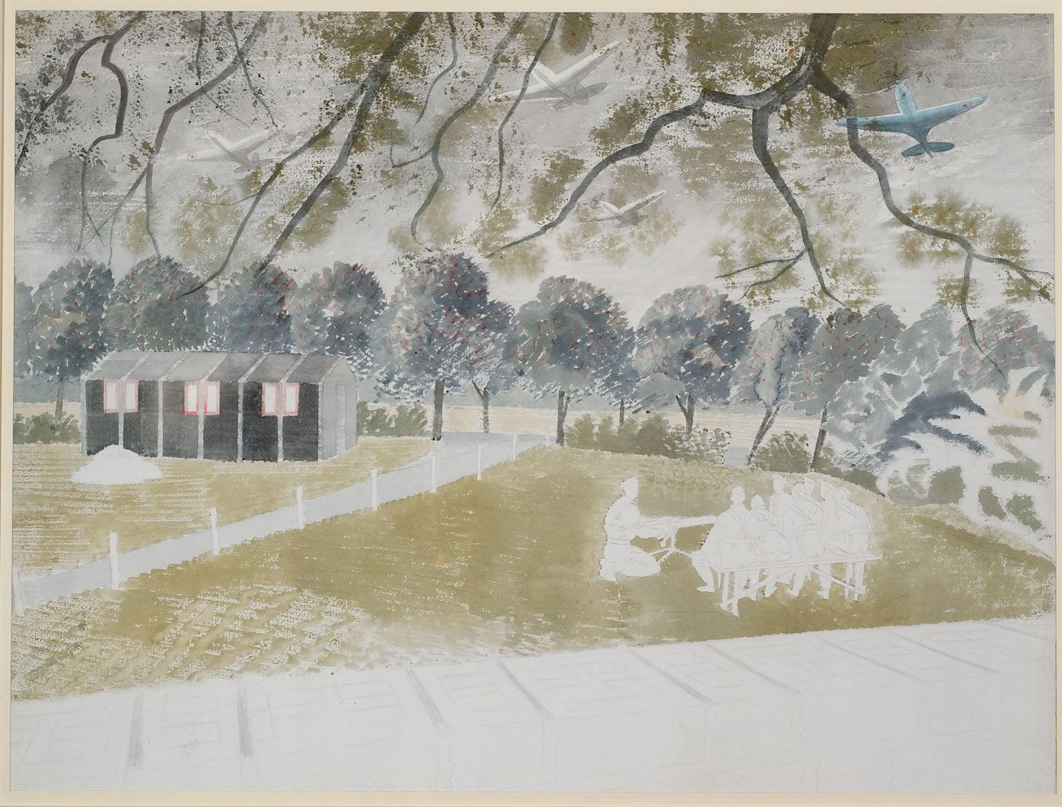 This work was incomplete when the artist died while working as an Official War Artist in Iceland in September 1942. Ravilious was working at RAF Sawbridgeworth in Hertfordshire in May 1942 while living near Braintree in Essex. It appears that he painted as much as possible of the watercolour on the spot but did not complete the group having the machine gun demonstrated. This work compliments a series of submarine lithographs by Ravilious ArtFunded in 2003 and invites comparison with an earlier watercolour by the artist of Sible Hedingham in Essex also ArtFunded in 2003.