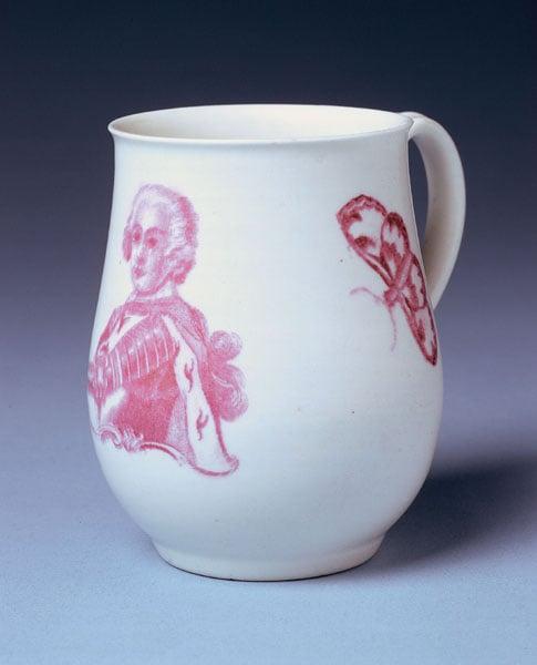 Derby porcelain mug bearing a printed portrait of the King of Prussia. It has a small bell shape with a grooved handle. A half-length portrait of the King of Prussia, above a simple scroll, flanked by a floral print and a butterfly is printed in puce.