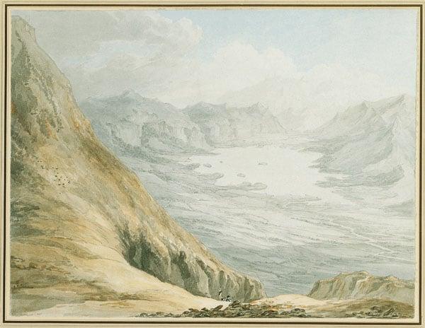 Thomas Hearne was among those who made the Picturesque Tour to the Lakes; he made two tours, in 1777 and 1778, both in the company of Sir George Beaumont and Joseph Farington who are probably represented in this view descending from the mountain. Hearne's restrained colour, and use of muted tones, is typical of his work.