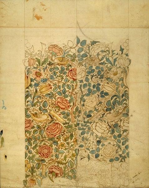 Morris' design for 'Chintz', registered early in 1883, is one of many of his designs on the theme of birds amidst flowers, foliage or fruit. The printed patterns involved very subtle dye colours and a large number of separate blocks. This admitted effects of great tonal variety and managed to translate Morris' complex designs with almost complete fidelity.