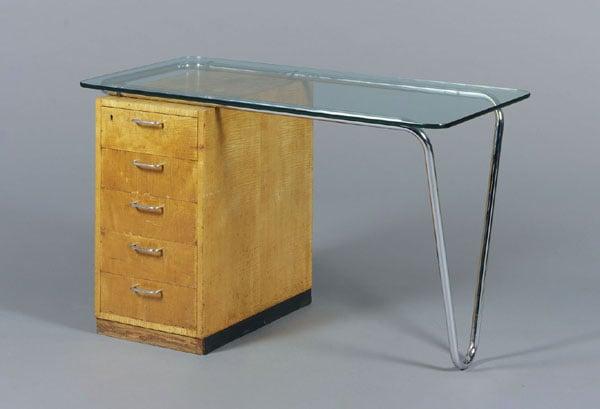 The desk is a combination of glass, wood and tubular steel, a material popular with the design avant-garde in the 1920s and 1930s. The design emphasises the structural and visual distinctions between the steel, glass and wood. This is the desk at which Michael Ventris worked as he deciphered the Linear B script.