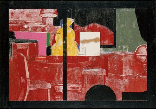 Interior of office with table, desk and three chairs. Subject deals with the legacy of the Holocaust and the banality of evil unleased by faceless bureaucrats. The final title was chosen 14 years after the artist began the painting when he read the obituary of Walter Rauff, 'Schreibtischtaeter' ('desk-murderer'), an SS officer who designed mobile gas vans used before concerntration camps became operational. The fragment of canvas attached to the centre of the work depicts a fume-emitting contraption representing the latter.