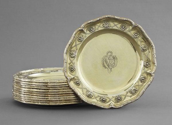 The silver dinner service associated with Kedleston is outstanding both for the rarity and sophistication of its design and for its carefully considered integration into the architectural schemes of James ‘Athenian’ Stuart and Robert Adam for Sir Nathaniel Curzon’s new dining room. The 12 plates display the banding of interlacing rosettes and leaves that defines the Kedleston service and is so unusual on silver of the period. The centre of each plate is engraved with the arms of Curzon impaling Colyear for Sir Nathaniel Curzon and his wife Lady Caroline Colyear. This service will compliment the two drawings by Robert Adam of the plate display in the niche of the Kedleston Dining Room which are already in the collection at Kedleston Hall.