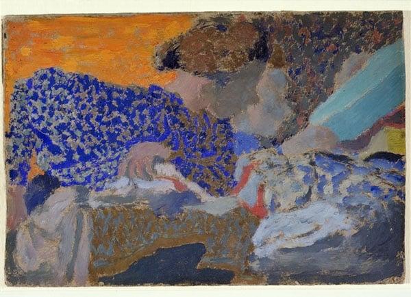 This work shows two young women who worked in the artist's mother's business. They have temporarily stopped sewing to look at something, perhaps the pattern they are following. The features of both women are indistinct; Vuillard emphasises rather their utter absorption in their task.