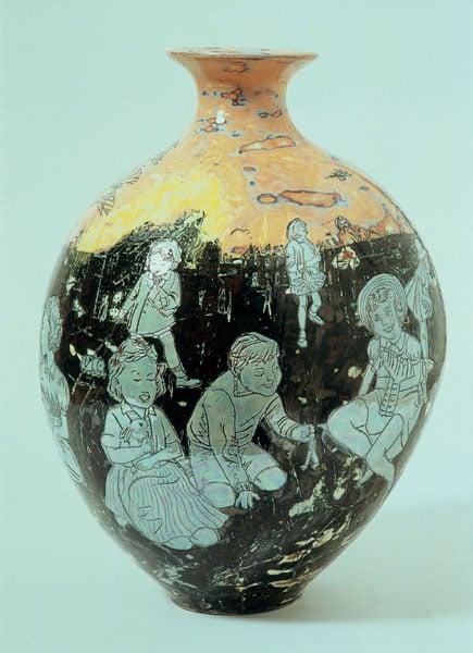 A large onion-shaped vase with a black glaze heavily incised throughout with depictions of smiling children, playing with small animals and toys and dressed in 1950s clothes. Behind them, are scrawled images of horror and war; burning buildings, blasted trees and naked figures, running screaming from others aiming rifles.