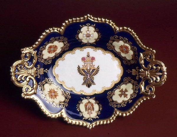 This magnificent centrepiece, with the rest of the original service, was made at the Coalport Factory in Shropshire for the visit of Tsar Nicholas I to England in 1845. An extremely fine piece, the Coalport centrepiece has a gros bleu ground with gilt border and incorporates six hand-decorated reserves around the central hand-painted depiction of the Order of St Andrew. The reserves show medals of the Orders of St George, Alexander Nevsky, St Vladimir, White Eagle, St Stanislas, and St Anne. The piece exhibits all the finest features of the Coalport Factory's products, high-quality moulding and body, detailed hand painting and gilding.