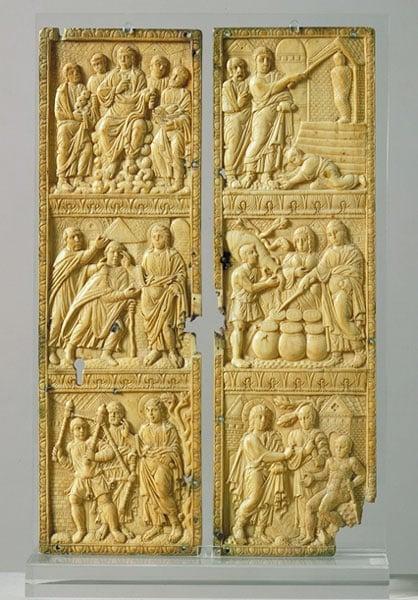 Represents the: Miracle of the Loaves and Fishes, Healing of the Blind Men, Healing of the Paralytic, Raising of Lazarus, Miracle of Cana and Healing of the Leper. On the reverse are faint traces of later painting . Probably Eastern Mediterranean.