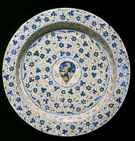 Hispano-Moresque armorial dish decorated in blue and gold lustre with bryony flowers and leaves, with a shield in the centre containing the arms of the Gentili family of Florence. Reverse is decorated with a central rosette surounded by two circles of flowers and leaves in gold lustre.