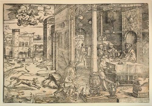This woodcut depicts Lazarus and the rich man. Lazarus is shown in rags with two dogs at his feet, imploring a rich man sitting at a dining table with musicians entertaining him and servants bringing him food and drink.