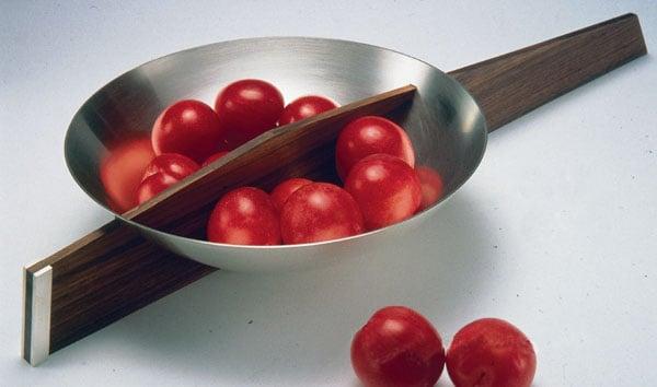 This is a piece from O'Connor's 'Landscape of Dining' project where she was particularly interested in the designed garden, specifically the implication of boundaries, planting and composition. The spun silver dish is dissected by a subtly tapering walnut spine with a silver finial. The piece balances on its spine.