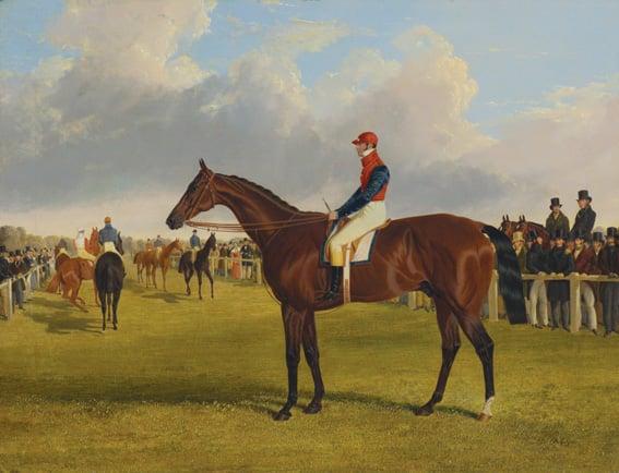 Portrait of 'Don John', the property of Lord Chesterfield, winner of the St. Leger, 1838, with jockey up and other horses on race course. One of four paintings purchased with funds supplied by the Public Art Gallery, Dunedin.