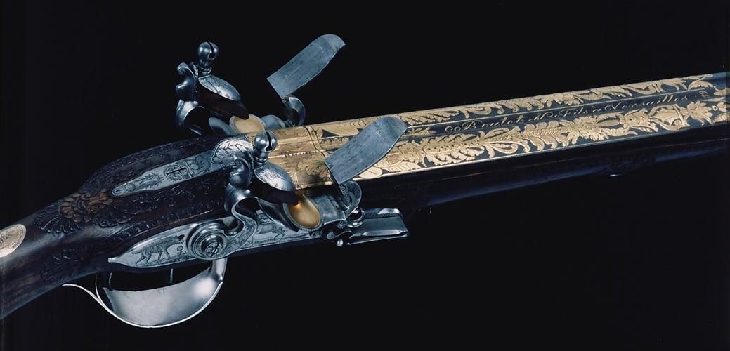 The stock is of walnut carved with anthemion and acanthus ornament into which are set the gun's silver cast-and-chased mounts. Set into the wrist is the Arms of the recipient. The barrels are decorated with gilded patterns.