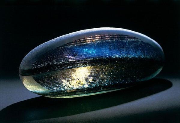 A translucent and irridescent glass shaped 'pebble' made from layers of glass through a complex process of block printing, sponging, fusing, grinding, slumping and polishing. Brian and Jenny Blanthorn are a husband and wife team who work together to create what they describe as 'unique works of art inspired by the patterns in nature'.