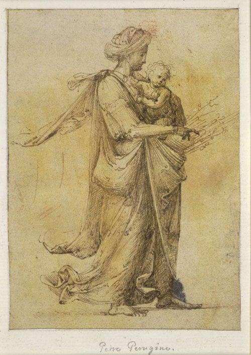 A woman walking to right carrying a child and a sheaf of corn. Part of an album of drawings belonging to Lord James Cavendish MP (d 1741), son of the second Duke of Devonshire (1665-1729), founder of the great collection of drawings at Chatsworth. The collection of drawings form an interesting relic of the great age of collecting in England.
