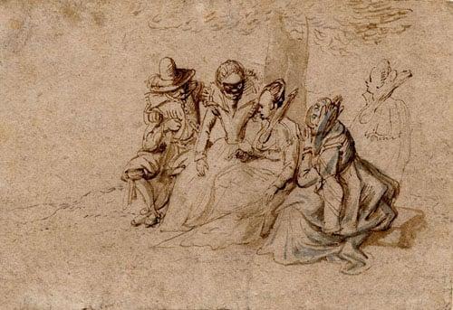 Depicts a man and three ladies wearing fashionable costume seated under a tree. This is one of 111 drawings bequeathed to the British Museum by Rosi Schilling in 1997. The majority of this collection of drawings formed by Dr Edmund Schilling was bequeathed to the British Museum through the Art Fund by his widow, Mrs Rosi Schilling, in 1993. Schilling was a former curator of the Stadelsches Kunstinstitut in Frankfurt, who emigrated to England in 1937. He was one of the few acknowledged specialists in this country on German graphic art, and built up his collection during the 1940s and 1950s in London when, Northern drawings were unfashionable and could be bought relatively inexpensively. His collection included drawings by major artists such as Hans Baldung and Lucas Cranach.