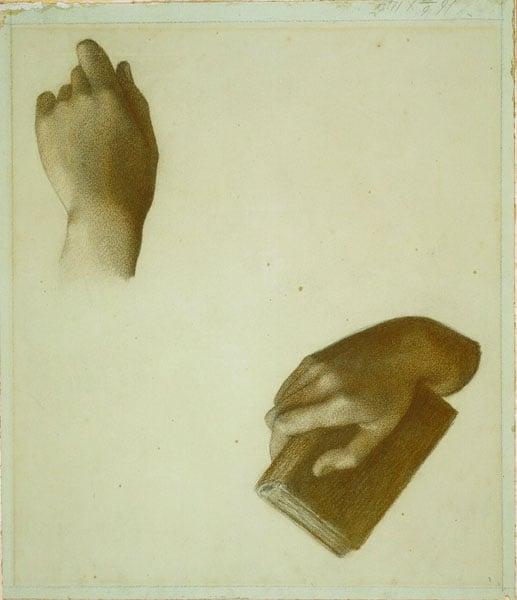 This chalk drawing of two hands was part of a collection of 8 works including 5 drawings by Rossetti bequeathed to 5 public collections through the Art Fund in 1947.