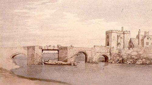 The drawing shows the bridge over the river Severn from the South West, with its Tudor gate-house on the east bank which was demolished in 1808.