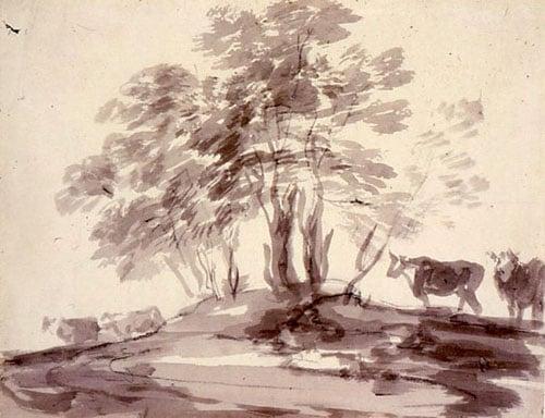 Small hill, covered in bushes and trees, lone tree, and two small figures centre background by stream. Part of a collection of 115 works distributed to 21 public collections. Sir Edward Marsh bequeathed his modern pictures to the Contemporary Art Society and the remainder of this collection to the Art Fund for selection and distribution to suitable galleries. The drawings consist mainly of works by English artists of the 18th and 19th centuries. Perhaps the most important groups are the Romneys, Wilsons and Rowlandsons all chosen with the discriminating taste which invariably distinguished Sir Edward Marsh's acquisitions.
