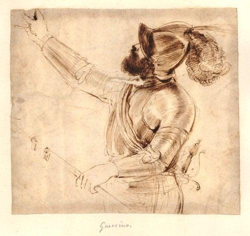 A bearded man in armour, his right arm raised, wearing a morian helmet with plume. He stands half length, in profile to the left, holding a spear in his left hand and raising, in his right, an unidentified object which is partly cut away by the top left corner of the drawing; he wears a plumed helmet. Part of an album of drawings belonging to Lord James Cavendish MP (d 1741), son of the second Duke of Devonshire (1665-1729), founder of the great collection of drawings at Chatsworth. The collection of drawings form an interesting relic of the great age of collecting in England.