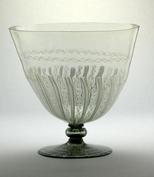 Large bowl made from blown glass, resting on hollow ribbed knop, with a plain foot. Decorated with white threads in a variety of patterns using the Venetian technique known as 'vetro a fili' or 'vetro a retorti'. The goblet is an extremely rare survival, made for the luxury market, and possibly intended for display to demonstrate the owner's wealth and taste rather than for use.