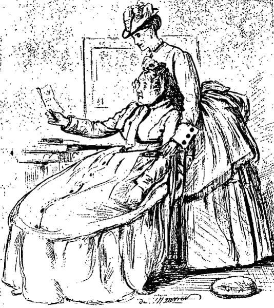 Six drawings for 'Punch' magazine including 'A Suspicious Old Granny (in the early days of telegrams)' with the caption 'My dear Child, this telegram is not from George! I've known George's handwriting ever since he was a boy, and this is quite different!' published in Punch, August 1874. Part of a collection of 300 drawings and illustrations bequeathed to 57 museums by the estate of George du Maurier through the Art Fund in 1934.